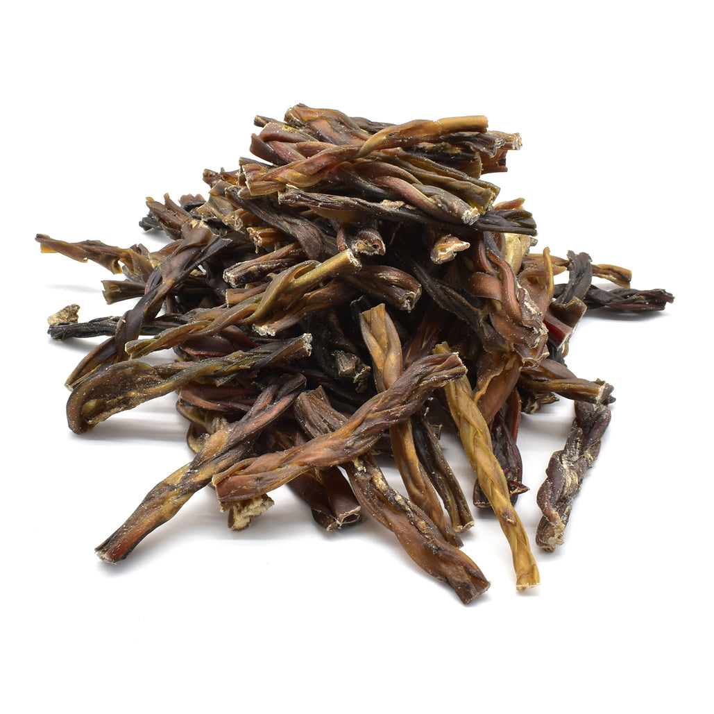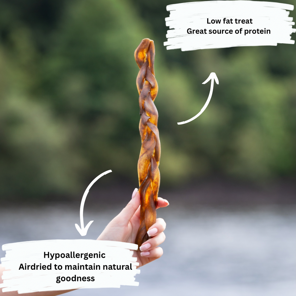 Our Braided Skins are made by braiding together strips of skin to create a durable and long-lasting chew. The braiding process not only adds to the treat's visual appeal but also provides an engaging chewing experience for dogs. Skins are often rich in collagen and protein, offering a satisfying and flavourful option for dogs who enjoy chewing. These treats can help promote dental health by encouraging dogs to gnaw, reducing plaque and tartar buildup.