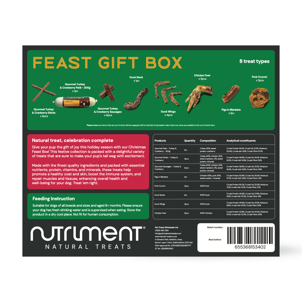 Christmas is arriving and our Christmas Feast Box is back for 2025! It includes 8 different irresistible treats, 4 various sources of protein and 22pcs in total. The proper treat for the holiday! Show your lucky dog how much you love them!